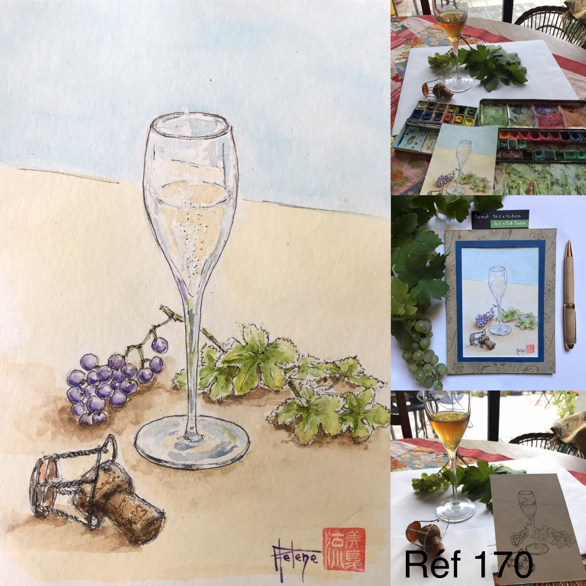 Aquarelle originale peinte à la main thème du champagne, format carte postale.